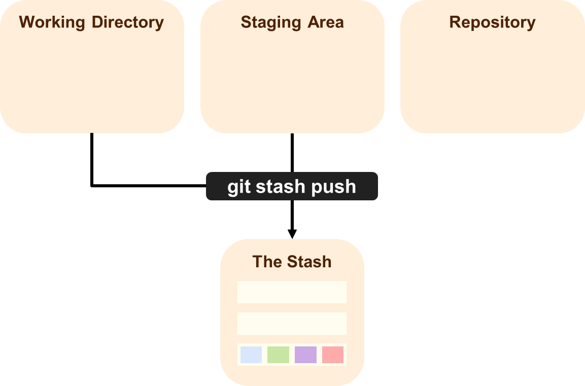 git stash, git stash push, git stash save, git stash pop, git stash apply, git stash list, git stash drop, git stash clear