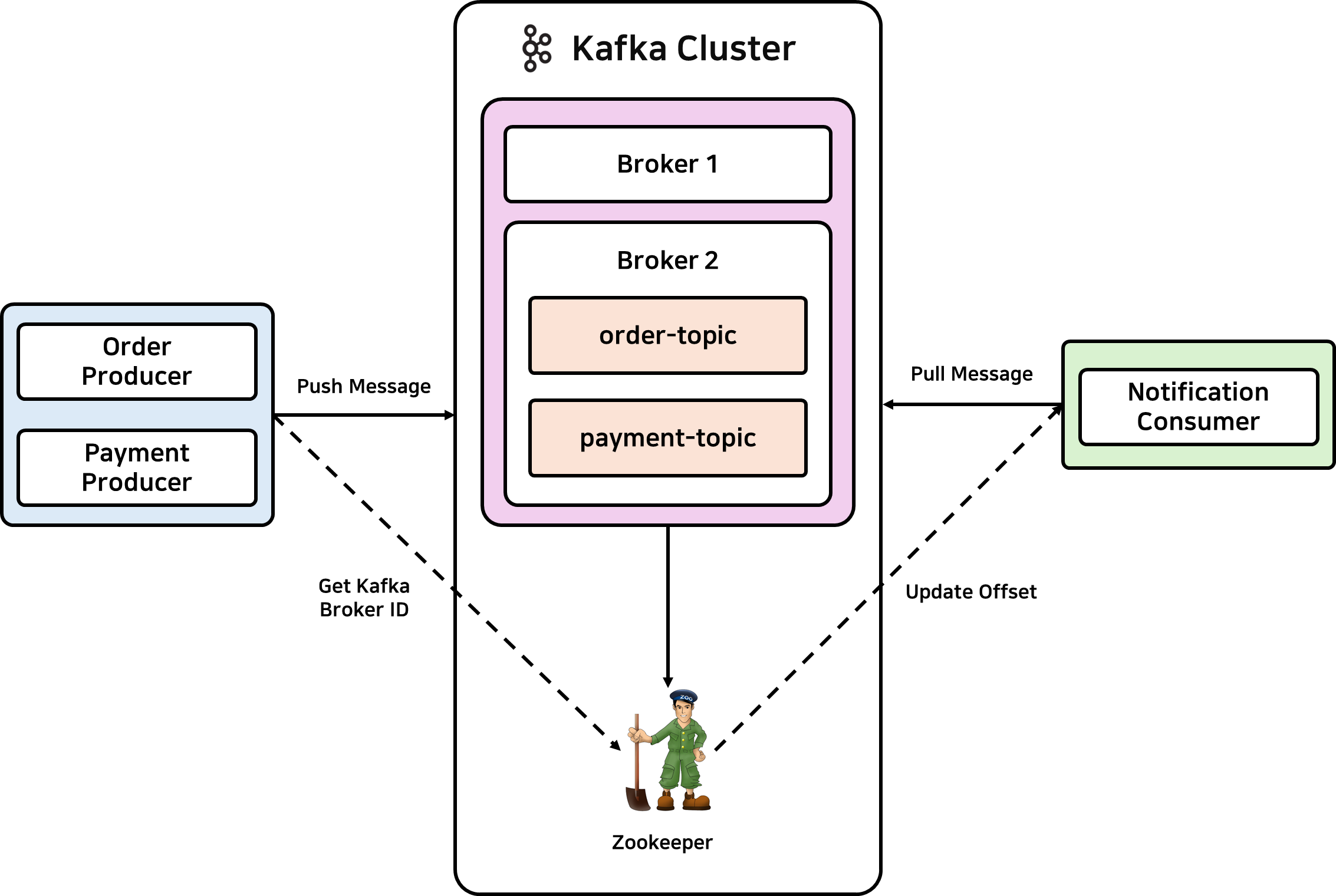 메시지를 각 topic별로, 비동기 방식으로 처리합니다.
