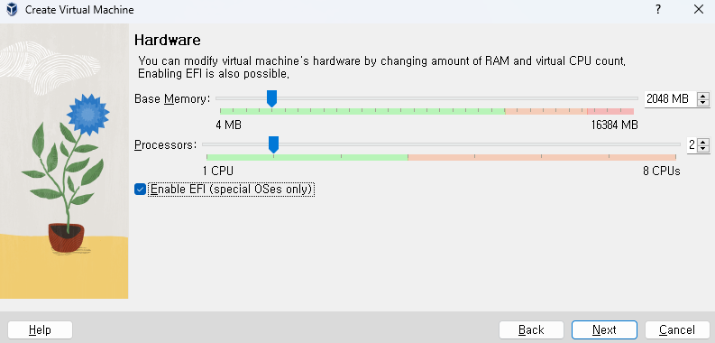 RAM 2기가, 디스크 용량은 10기가로 설정했습니다.