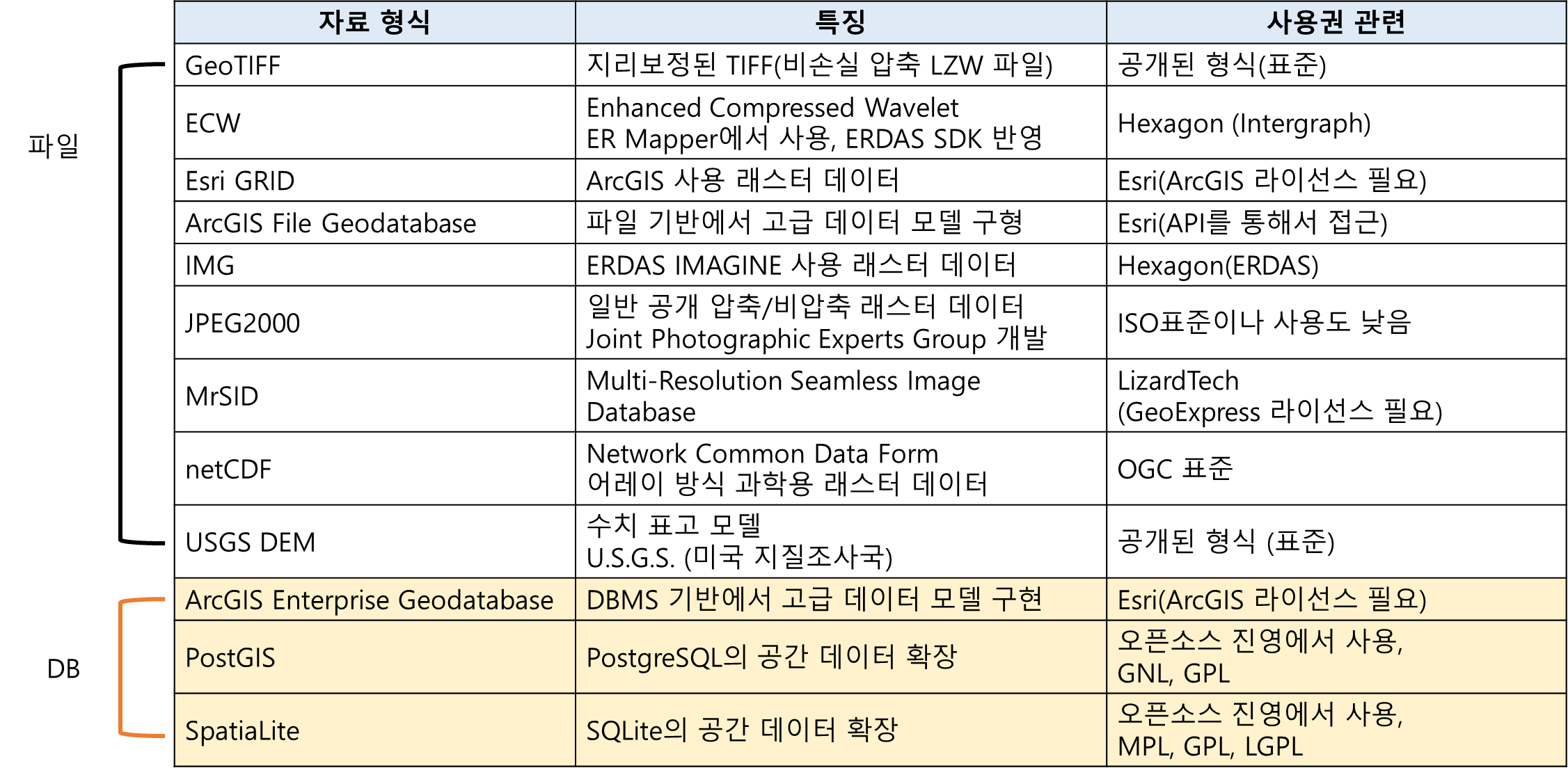 Vector, Raster 데이터에 따라 지원하는 자료형식이 다릅니다.