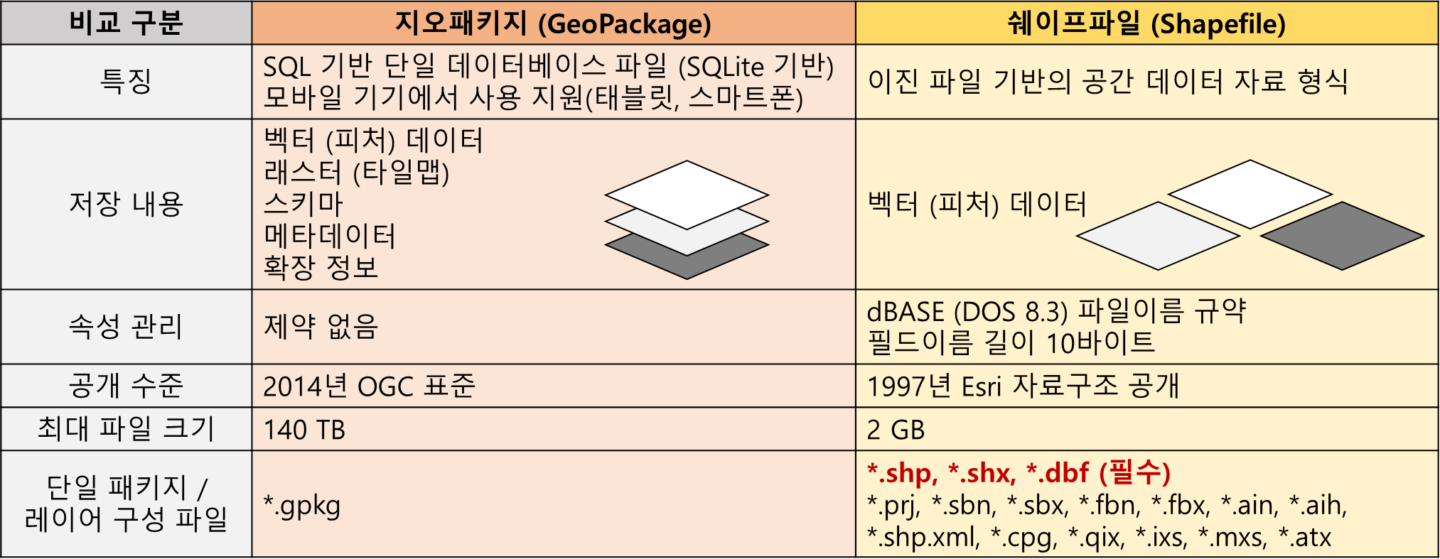 GeoPackage와 Shapefile을 비교하면 아래와 같습니다.