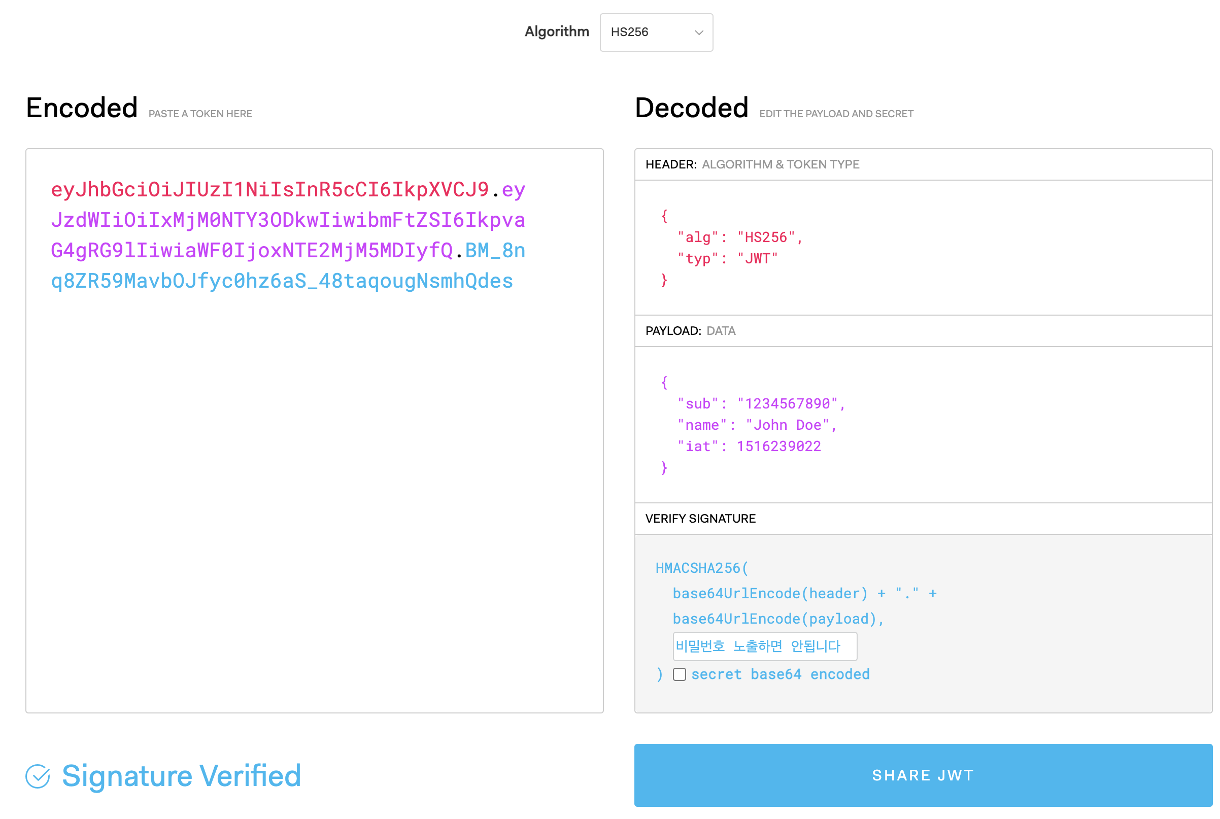 HMAC SHA256 알고리즘을 사용하는 예시