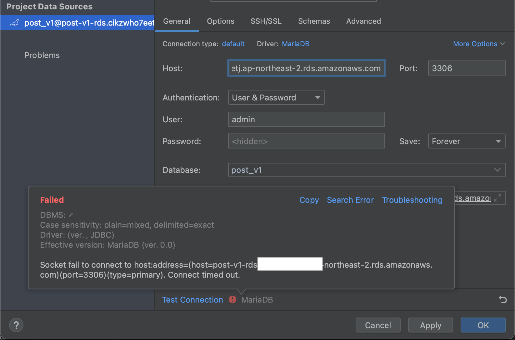 inteliJ database tool에서 rds에 연결이 실패했습니다.