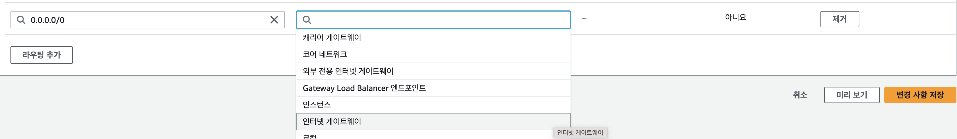 라우팅 테이블에 인터넷 게이트가 없는 경우,