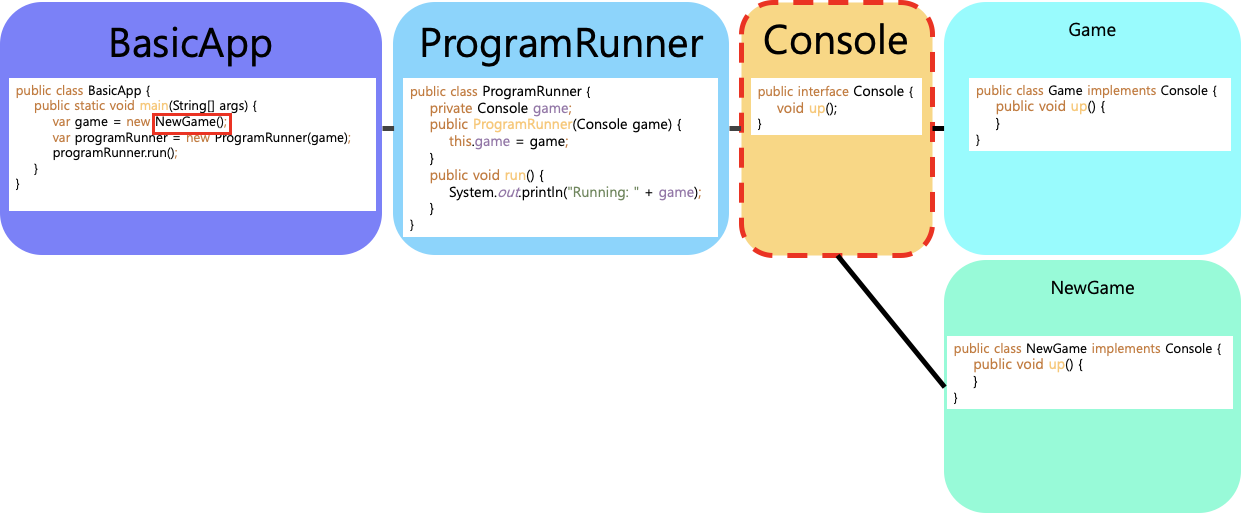 이제 인터페이스(Console)를 도입하여 느슨한 결합(Loose Coupling)을 만들어보겠습니다.