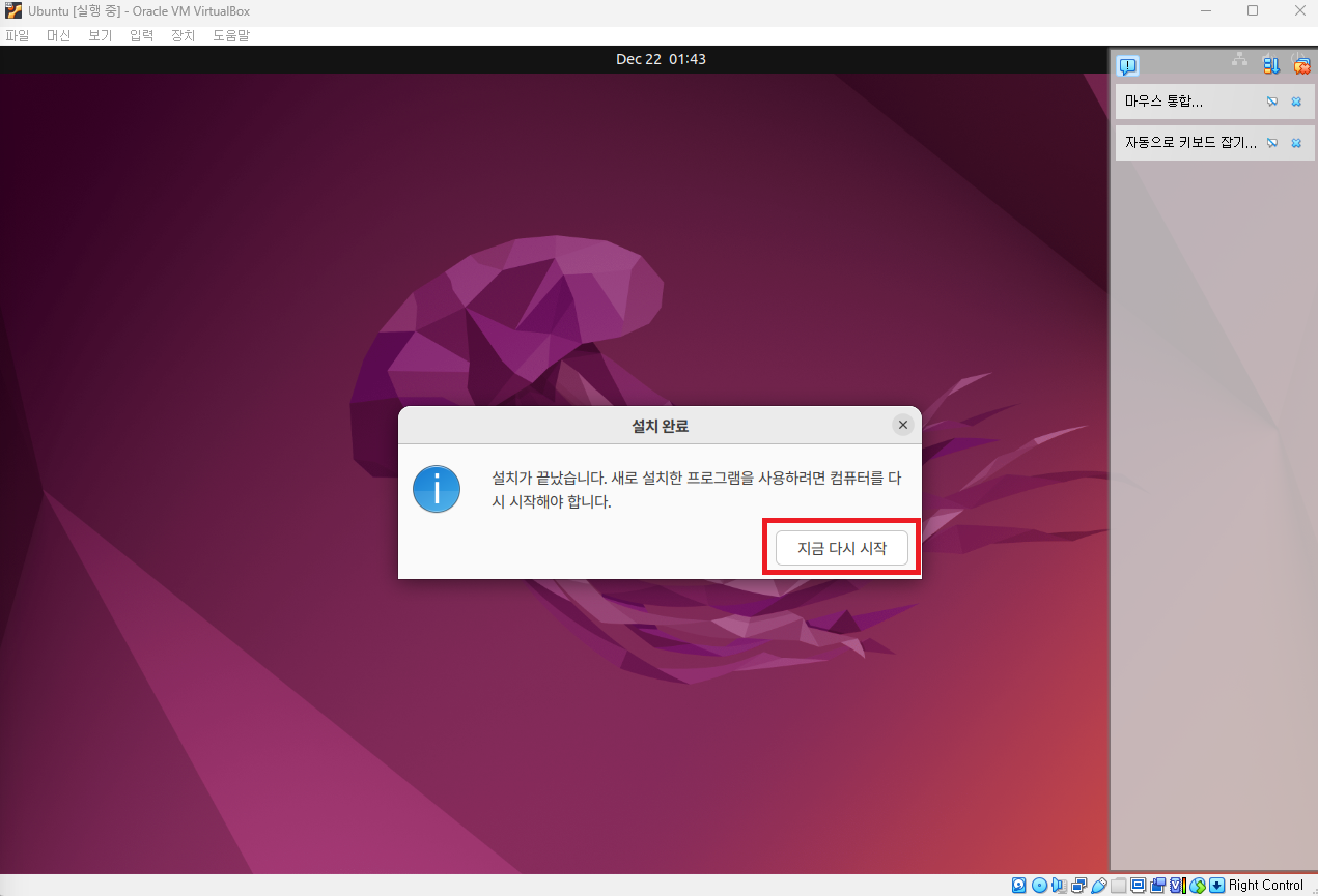 VM에 OS설치를 완료했습니다.