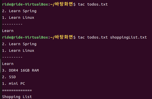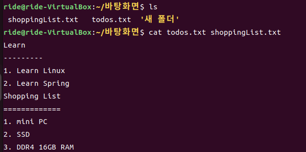 cat의 매개변수(입력값)에 여러 파일을 넣으면, 이를 결합하여 출력합니다.