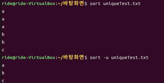 -u 옵션은 unique의 준말로, 중복값을 제외하여 정렬합니다.