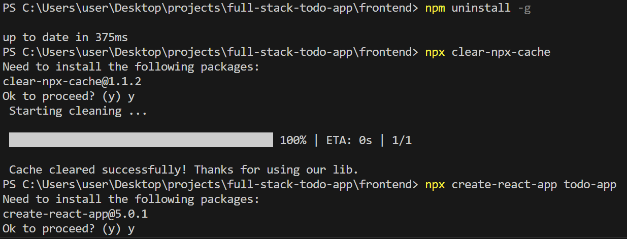 터미널에서 아래 명령어를 입력하여 npm프로젝트를 삭제하고 캐시를 제거합니다.