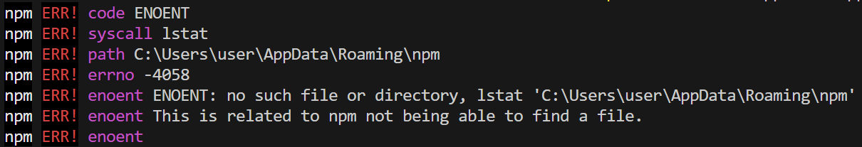 npm ERR! enoent ENOENT: no such file or directory, lstat 'C:\Users\user\AppData\Roaming\npm'