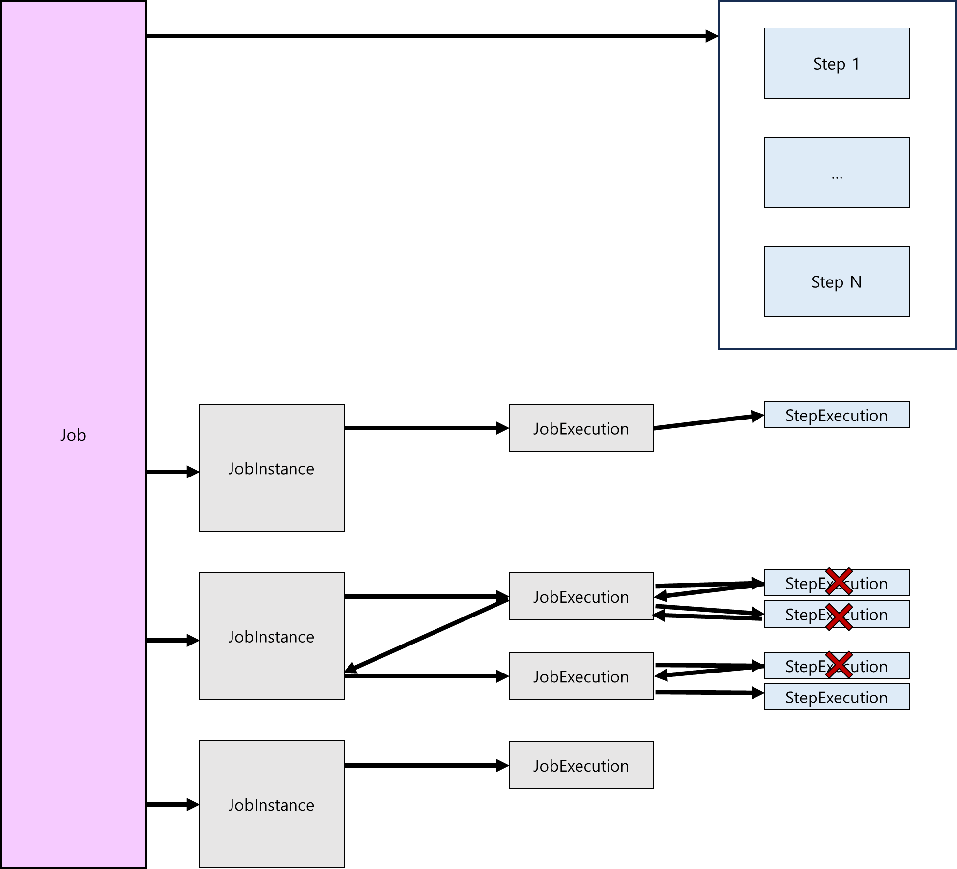 이처럼 JobInstance는 논리적 단위이며, Step은 개념적인 단위로 간주할 수 있습니다.