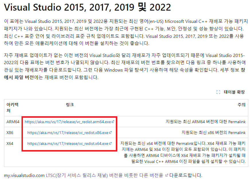 https://learn.microsoft.com/ko-kr/cpp/windows/latest-supported-vc-redist?view=msvc-160#visual-studio-2015-2017-2019-and-2022사이트로 이동하여 필요한 버전을 다운로드 받습니다.