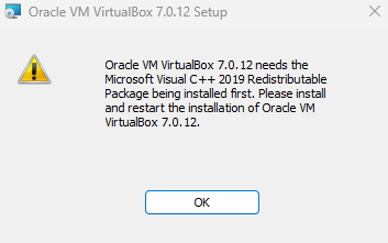 Oracle VM Virtual Box x.x.x needs Microsoft Visual C++2019 Redistributable packet being installed first.