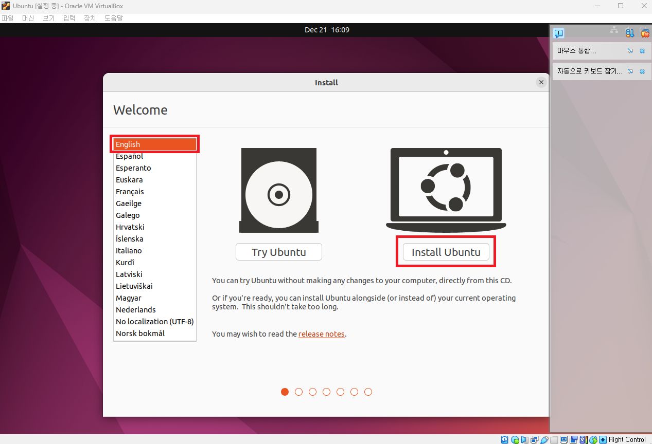 이제 언어를 선택하고 Install Ubuntu를 클릭합니다.