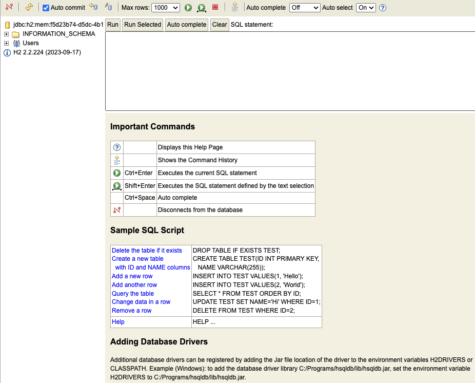 2023-12-22T19:59:55.150+09:00 INFO 7730 --- [ main] o.s.b.a.h2.H2ConsoleAutoConfiguration : H2 console available at '/h2-console'. Database available at 'jdbc:h2:mem:f5d23b74-d5dc-4b11-a081-e010973ddbe0'