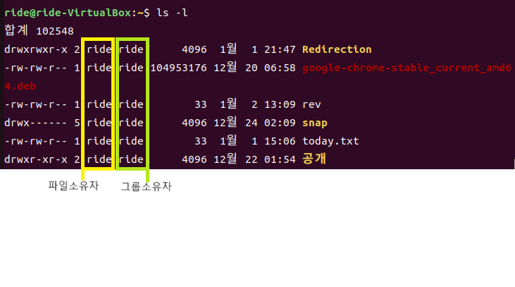 파일 소유자나 그룹 소유자, 또는 그 외 사용자가 가진 권한을 표시하는 것이며,